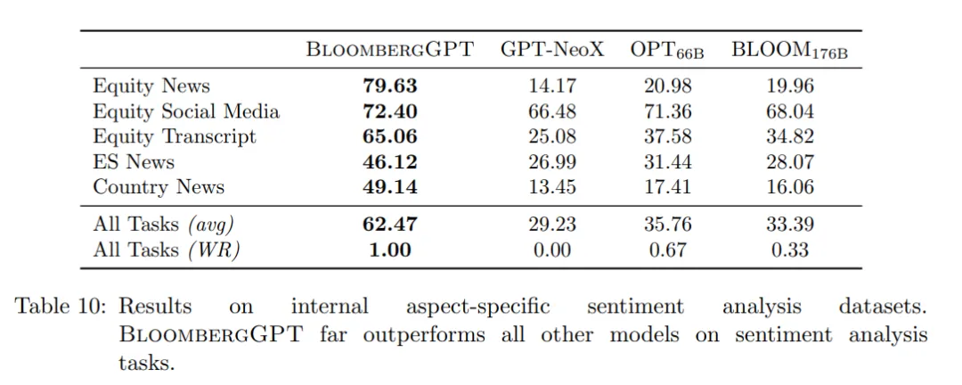 表 10 展示了在四个内部特定的情感分析任务中,BloombergGPT 的表现比所有其他测试模型都要好,而且拉开了一定差距。