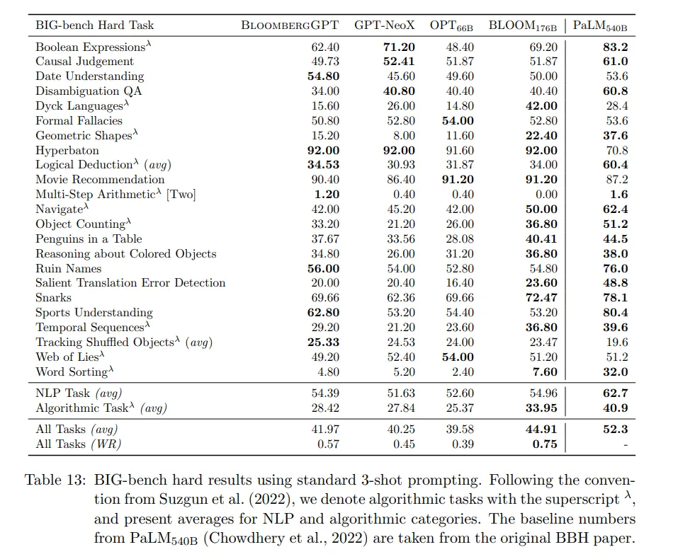 表 13 展示了在 BIG-bench Hard 每个任务的结果。总体来说,虽然 BloombergGPT 落后于大得多的 PaLM540B(10 倍参数)和 BLOOM176B(3.5 倍参数),但它是相似规模的模型中表现最好的,其性能比 GPT-NeoX 或 OPT66B 都更接近 BLOOM176B。它还在日期理解、hyperbaton(形容词排序)和跟踪打乱目标方面取得了所有模型中的最佳表现。按照这个基准,可以发现开发金融专用的 BloombergGPT 并没有以牺牲其通用能力为代价。