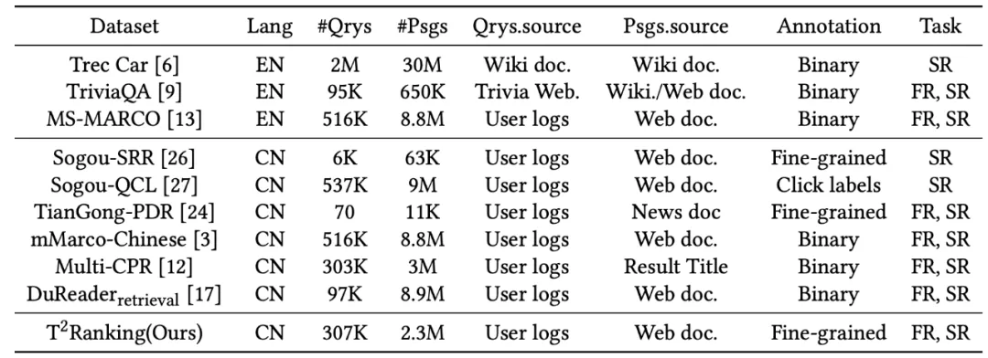 1)这些数据集不是大规模的或者相关性标签不是人工标注的,特别是在中文场景下。Sogou-SRR 和 Tiangong-PDR 仅包含了少量的查询数据。虽然 mMarco-Chinese 和 Sogou-QCL 规模较大,但前者基于机器翻译,后者采用的相关性标签为用户的点击数据。最近,Multi-CPR 和 DuReader_retrieval 两个规模相对较大的数据集被相继构建和发布。2)已有数据集缺乏细粒度的相关性标注信息。大部分数据集采用了二值相关性标注(粗粒度),即相关或者不相关。已有工作表明细粒度的相关性标注信息有助于挖掘不同实体之间的关系和构建更加精准的排序算法。然后已有数据集不提供或者仅提供少量的多级细粒度标注。例如 Sogou-SRR 或者 Tiangong-PDR 仅提供不超过 10 万个的细粒度标注。3)假负例问题影响了评价的准确性。已有数据集受到了假负例问题的影响,即有大量相关文档被标记为不相关文档。这一问题是由于大规模数据中人工标注数量过少引起的,会显著影响评价的准确性。例如在 Multi-CPR 中,对于每一个查询词只有一个段落会被标记为相关,而其他都会被标记为不相关。DuReader_retrieval 尝试让标注者人工检查并且重新标注靠前的段落集合来缓解假负例问题。
