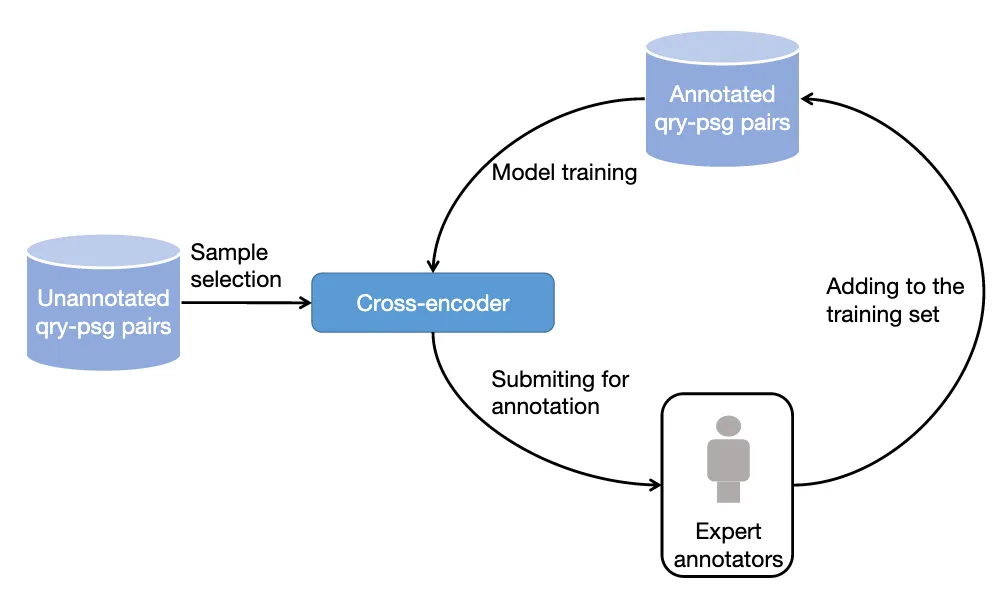 在实践中,我们观察到并不是所有的训练样本都能够进一步提升排序模型的性能。对于模型能够准确预测的训练样本,对于后续模型的训练助益有限。因此,我们借鉴了主动学习的想法,让模型能够选择更有信息量的训练样本进行进一步的标注。具体而言,我们先基于已有的训练数据,训练了一个以交叉编码器为框架的查询词 - 段落重排序模型,接着我们用这个模型对其他数据进行预测,去除过高置信分数(信息量低)和过低置信分数(噪音数据)的段落,对保留的段落进行进一步标注,并迭代这一流程。