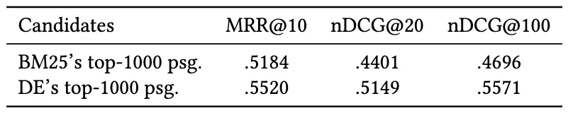 相比于段落召回阶段,重排序阶段需要考虑的段落规模较小,因此大多数方法倾向于使用交互编码器(Cross-Encoder)作为模型框架,在本工作中,我们测试了交互编码器模型在段落重排序任务上的性能,我们采用 MRR 和 nDCG 作为评价指标,实验效果如下: