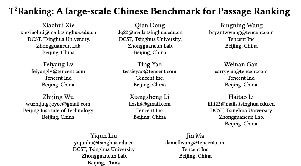 - 论文信息:Xiaohui Xie, Qian Dong, Bingning Wang, Feiyang Lv, Ting Yao, Weinan Gan, Zhijing Wu, Xiangsheng Li, Haitao Li, Yiqun Liu, and Jin Ma. T2Ranking: A large-scale Chinese Benchmark for Passage Ranking. SIGIR 2023.
