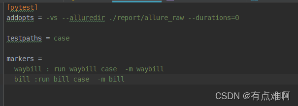 (之前这些和pytest好像没啥关系啊,都自己写的方法) 更改默认运行pytest命令 其他参数百度 addopts = -vs --alluredir ./report/allure_raw --durations=0 --alluredir ./report/allure_raw 设置报告原始数据的目录 设置运行用例目录 testpaths = case 设置标签,可以根据标签来运行指定用例 markers = waybill : run waybill case -m waybill bill :run bill case -m bill