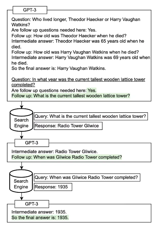 - [Self-Ask (Press et al. 2022) ] 是一种反复 prompt 模型提出后续问题以迭代构建思维过程的方法。可以通过搜索引擎结果回答后续问题。同样,IRCoT [Interleaving Retrieval CoT;Trivedi et al. 2022] 和 ReAct [Reason + Act;Yao et al. 2023] 将迭代 CoT 提示与维基百科 API 查询相结合,以搜索相关实体和内容,然后将其添加回语境中。