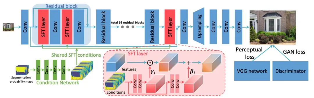 图1 SFT layer可以方便地应用于现有的SR网络。所有的SFT layer共享一个条件网络。条件网络的作用是从先验中产生中间条件,并将条件广播给所有的SFT layers,以便进一步产生调制参数