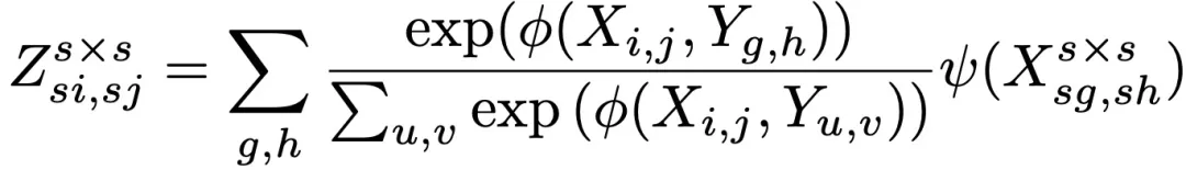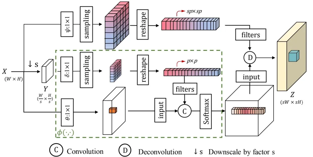 假设输入的特征图是X(W×H),为了计算pixel-patch的相似性,需要首先将X下采样为Y(Ws×Hs),并找到X和Y之间的像素相似性,最后用X中相应的s×s patch来SR X中的像素,因此输出Z为sW×sH。跨尺度注意力(Cross-scale attention)可由上式改写为: