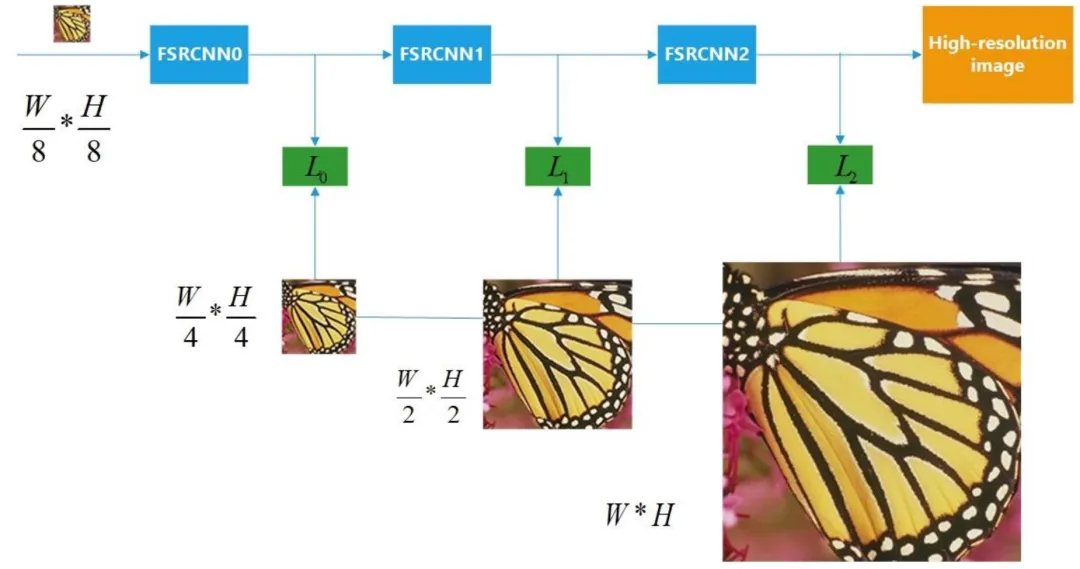 图2 CSRCNN网络结构。该网络由三个级联的FSRCNN组成,其中每个FSRCNN的放大系数为2。网络的输入大小为一个𝑊/8 ∗ 𝐻/8 LR图像,它被依次送入三个子FSRCNN中。每个子FSRCNN可以将输入图像的大小放大一倍。对于每个子网络,网络的输出图像将与相应的真实HR图像形成一个子损失函数,而这些子网络的子损失函数之和最终构成整个网络的损失函数