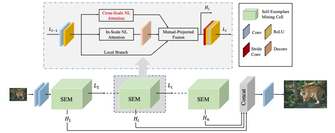 在单幅图像超分辨率SISR领域,使用大量的外部图像数据训练的模型可以学到有用的局部恢复信息,但近来探索图像内部的相似性也开始引起研究人员的兴趣,比如使用non-local 注意力模型利用低分辨率图像long-range相似性构建的超分辨率算法提高了SR的效果。本文提出了用于SISR任务的第一个跨尺度非局部(Cross-scale Non-local,CS-NL)注意力模块,计算图像内部的像素到块以及块到块的相似性,此外,还提出了一个强大的自样本挖掘模块(Self-Exemplars Mining,SEM)单元,在单元内部通过结合局部、尺度内非局部和跨尺度非局部特征的相关性,尽可能挖掘更多的的先验信息。