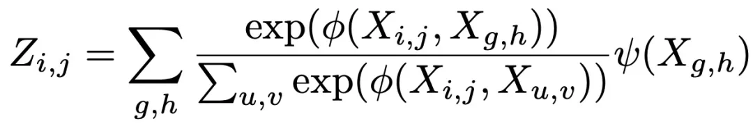 其中,z代表经过NL模块之后i,j位置的值,X_i,j表示输入特征图i,j位置的值,X_g,h表示输入特征图g,h位置的值,X_u,v表示任意位置的值,这个公式表示遍历整个特征图像每个像素点求得与X_i,j之间的关系,然后用得到的关系整除所有位置与X_i,j的关系,这样就得到了X_g,h所在位置对X_i,j影响权重的大小,再加入X_g,h位置向X_i,j位置的映射,最终将所有位置向X_i,j的映射进行加权求和得到i,j位置新的表示。