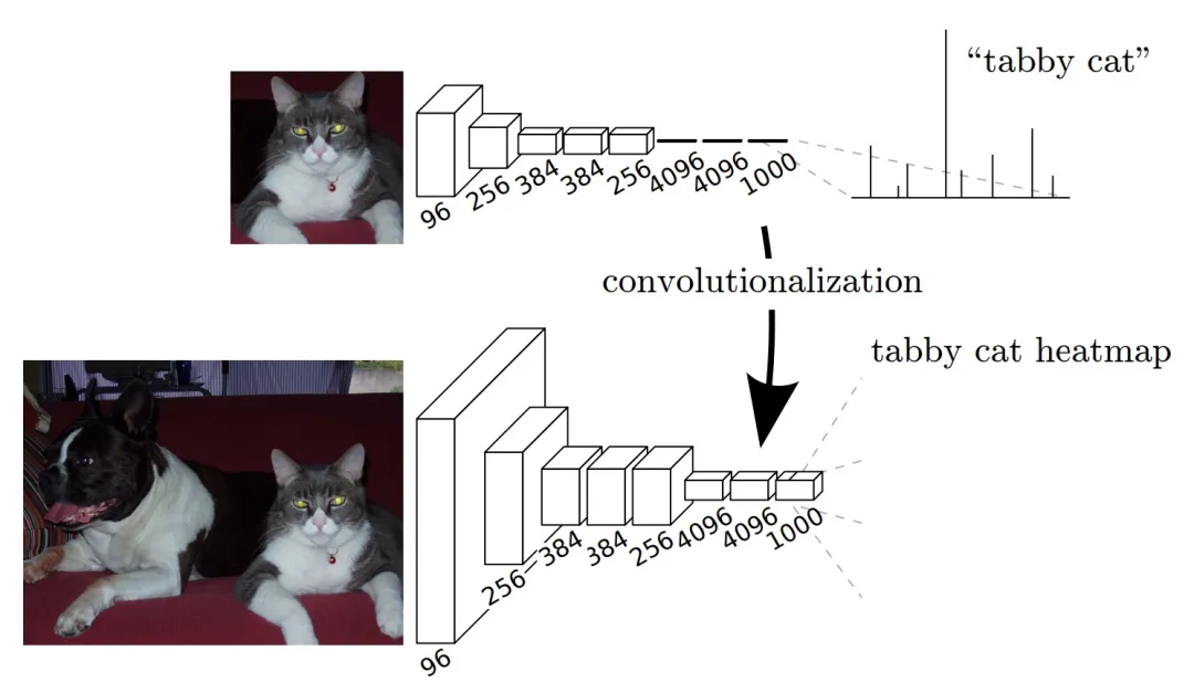 图1 将全连接层转化为卷积层使分类网能够输出热力图。添加层和空间损失生成一个高效的机器,用于端到端的密集学习