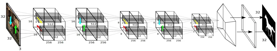 图3 ReSeg网络。由于空间的原因未展示预训练的VGG-16卷积层,我们用它来预处理ReSeg的输入。前两个RNN(蓝色和绿色)被应用于图像的2x2x3 patches,它们的16x16x256特征图被串联起来,并作为输入送入下两个RNN(红色和黄色),它们读取1x1x512 patches并发出第一个ReNet层的输出。两个类似的ReNet层被堆叠起来,然后是一个上采样层和一个softmax非线性