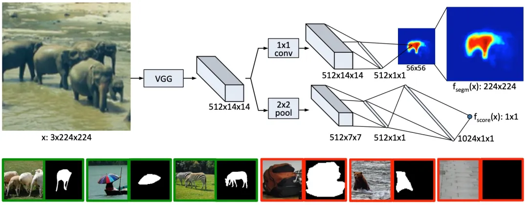 图6(顶部)DeepMask模型结构:网络在共享特征提取层之后被分成两个分支。上面的分支预测位于中心的物体的分割掩码,而下面的分支预测输入patch的物体得分。(底部)训练三要素示例:输入patch x、掩码m和标签y。绿色patch包含满足指定约束的对象,因此被分配到标签y=1。负样本的Mask(以红色显示)没有使用,只是为了说明问题