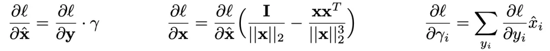 ParseNet利用了L2范数来归一化特征的融合过程。具体而言,给定d维输入x,算法通过计算其L2范数并在整个维度内实现归一化。此外,如果只是单纯地对所有输入层进行归一化,不仅会减慢网络的训练速度,同时也会改变该层的尺度。因此,还需要对其增加一个尺度参数gamma,将归一化的结果进行尺度缩放(缩放结果为y)。这一过程增加的参数量等于所有的通道数之和,因此在反向传播过程中是可以忽略的。具体的反向传播公式如下: