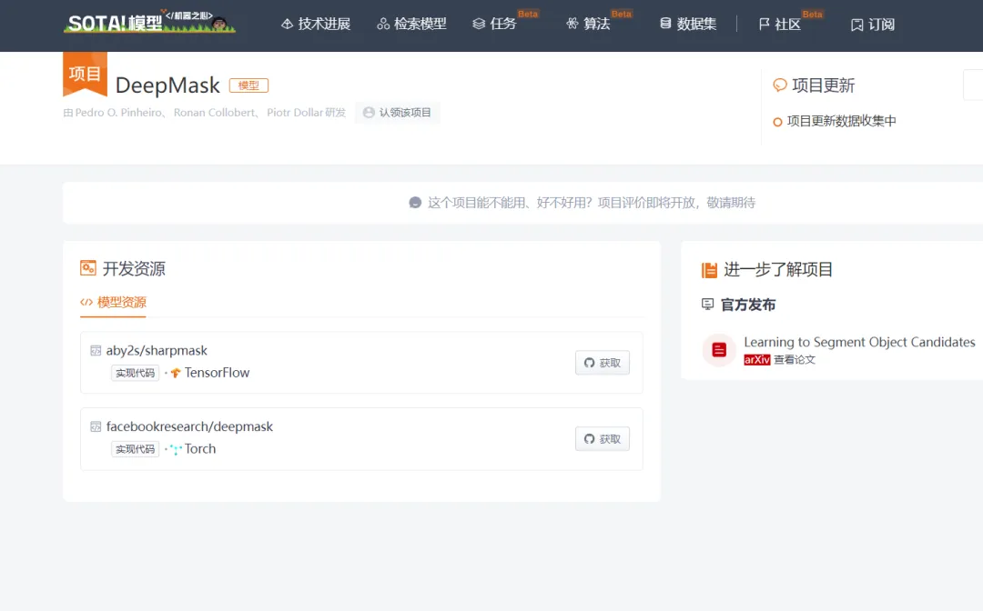 | DeepMask | 前往 SOTA!模型平台获取实现资源:https://sota.jiqizhixin.com/project/deepmask |