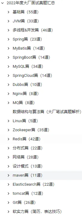 如果大家目前确实脑子里没有什么思路,LZ今天就给大家分享一份包含了23个知识点,从基础到进阶都有的2022年度互联网大厂(Java岗)面试真题汇总。由于篇幅限制LZ下面就只展示部分内容,需要完整版的小伙伴可以点击此处来获取就可以了!