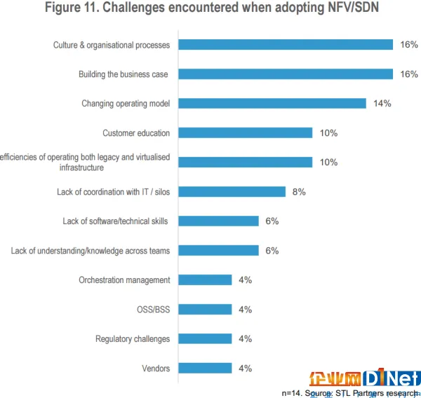 另一方面,研究还确定了采用SDN/NFV时遇到的关键挑战。排名前两个的挑战是“文化和组织过程”和“业务案例”,两者都占16%的比例。其次是“变更运营模式”(14%),再其次是“用户教育”和“运行传统和虚拟化基础设施低效率”(均为10%)。
