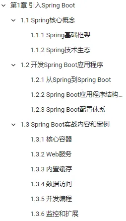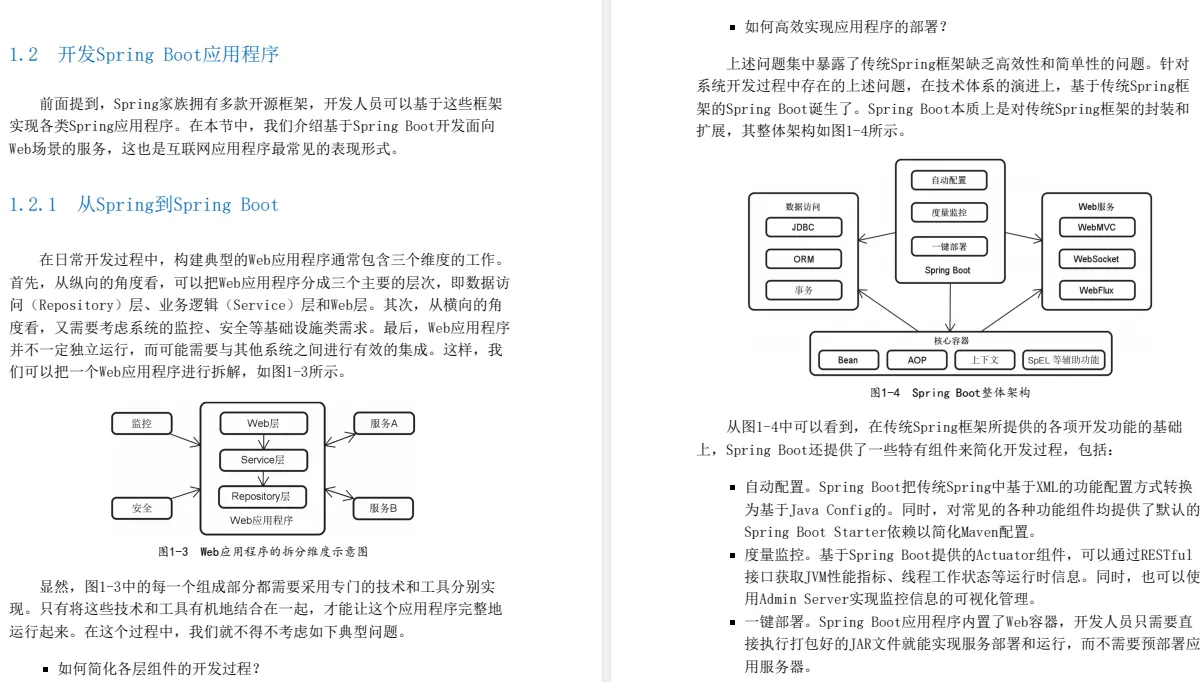 文档从Spring Boot进阶的角度切入,分为了七部分,分别是Spring Boot概述,核心容器,Web服务,,内置缓存,数据访问,并发编程,监控和扩展。由于一共有500多页,下面我就只能展示部分内容了,如果有需要完整版的小伙伴可以点击此处来获取就可以了!