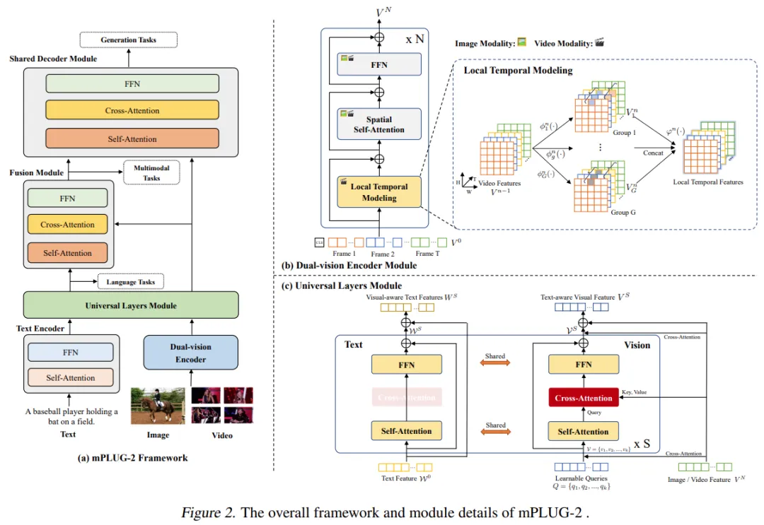 模型框图如上图 2 所示:(1) mPLUG-2 设计了⼀个统⼀的双 (dual) 视觉编码器模块,其中视频与图像输⼊共享的标准 Transformer 模块,⽤于建模空间信息。局部时域建模模块⽤于视频相关任务的时域关系建模。(2) mPLUG-2 设计了⼀个新颖的通⽤层模块 ( universal layers module),⽤于作为不同模态之间的枢纽,其通过共享⾃注意⼒模块将视觉和语⾔模态投影到共同的以语⾔为导向的语义空间中。(3) mPLUG-2 使⽤额外的交叉注意⼒模块将通⽤视觉表示 (universal vision representation) 与原始细粒度视觉表示融合。详细的模块设计如图 2 所示。最后,mPLUG-2 的不同模块通过任务和模态指令 (task and modality instructions) 在单模态和跨模态任务上进⾏联合预训练。在推理过程中,mPLUG-2 可以使⽤模块化 Transformer 架构为各种单模态和交叉模态任务选择不同的模块。
