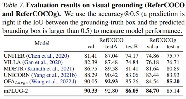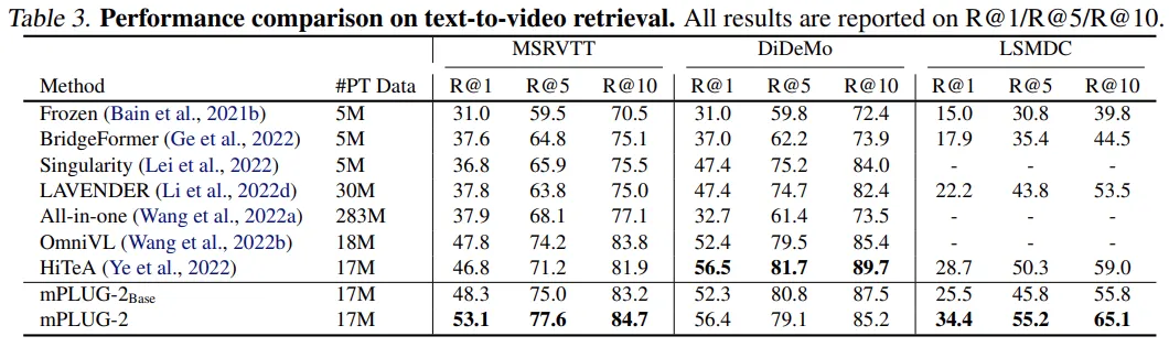 研究者在多模态理解型和生成型的相关任务上评测 mPLUG-2 的性能,包括: multimodal retrieval、question answering、visual grounding 和 captioning 等,实验结果表明其可以得到 SOTA 的性能。