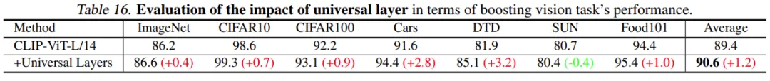 另外,研究者还发现,⿎励模态协作的通⽤层 universal layer 可以得到更小的 modality gap。