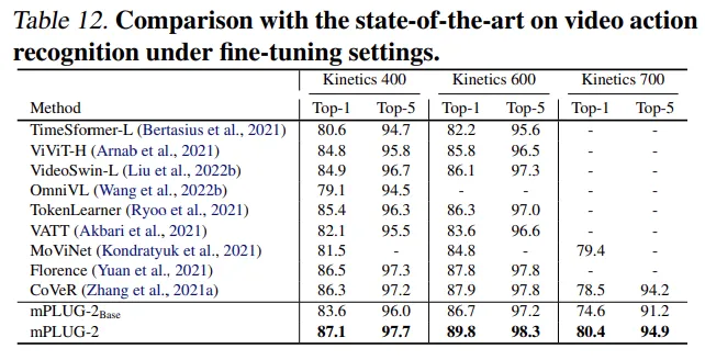 研究者发现,mPLUG-2 在纯视觉任务上,如行为识别,图像分类任务,可以取得具有竞争力的性能。