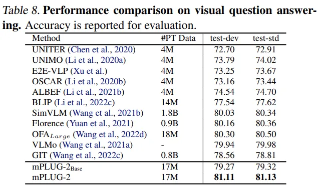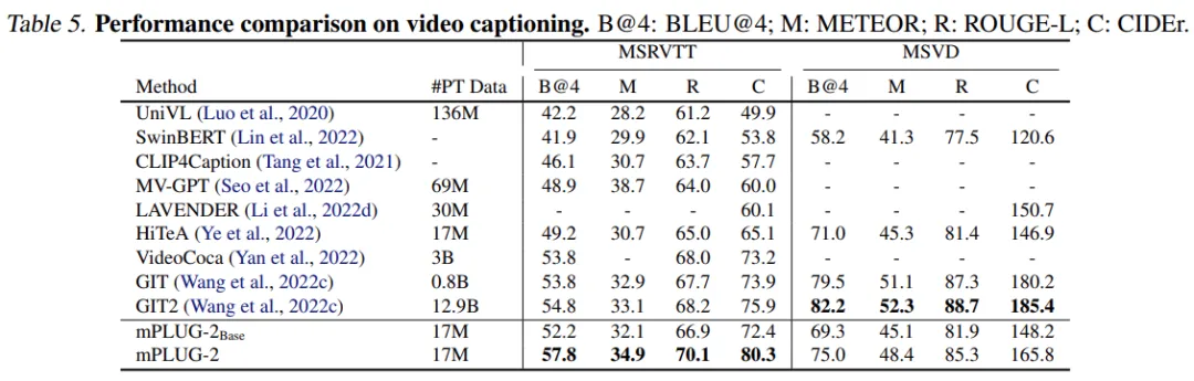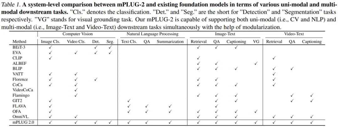 mPLUG-2 在 30 多个有挑战性的单模态和跨模态理解和⽣成基准测试中评估了 mPLUG-2 的性能,它在相似的模型大小和数据规模下取得了最先进或有竞争力的结果。