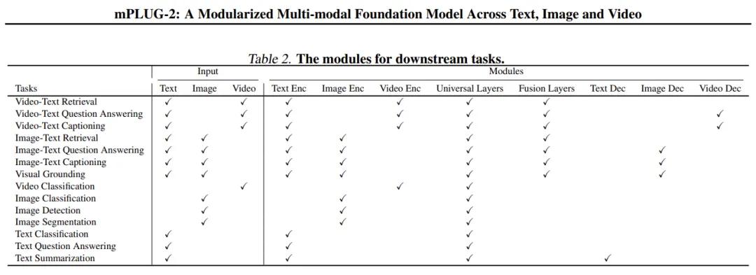 基于模块化的设计,不同的模块可以灵活地选取和组合,以适应⼤量的单模态和多模态的理解和⽣成任务。支持的下游任务的详细信息在表 1 中给出,可以看到 mPLUG-2 可以处理多种跨⽂本、图像和视频的不同类型的下游任务。下表 2 中也提供了不同的下游任务所需要的模块组合。