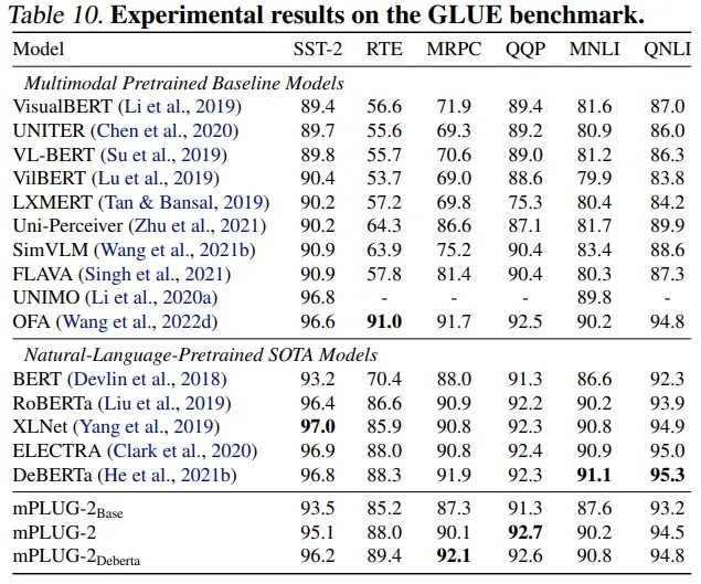 研究者发现,相比于专⽤语⾔预训练模型和其他多模态预训练模型,mPLUG-2 在 GLUE benchmark 上可以取得可⽐的性能。实验结果证明了使⽤ universal layer 做模态协作的有效性。