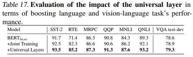 研究者在 baseline 的基础上,添加他们设计的通⽤层 universal layer。可以发现,通过鼓励模态协作,在单模态或者跨模态任务上,都会有明显的性能提升,证明了通⽤层 universal layer 的有效性。