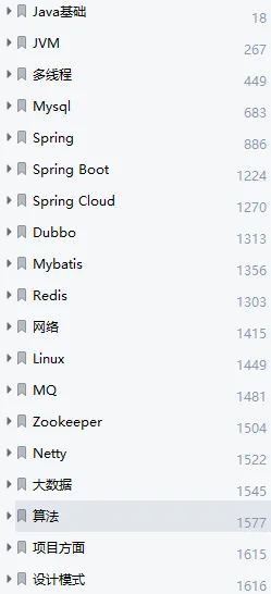 文档涵盖Java基础,设计模式,JVM,多线程,Mysql,Spring,Spring Boot,Spring Cloud,Dubbo,Mybatis,Redis,网络,Linux,MQ,Zookeeper,Netty甚至大数据算法项目方面,足足有1658页,可以说是比较全的了。篇幅限制就只为大家展示目录跟部分内容了,需要完整版的小伙伴可以点击此处来获取就可以了!