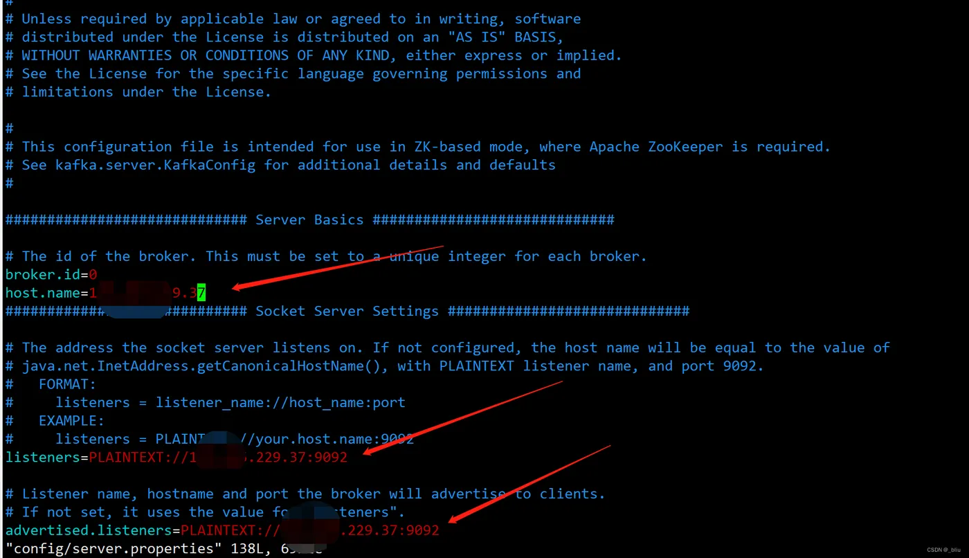 cd kafka_2.12-3.3.1 vim config/server.properties host.name=yourhost listeners=PLAINTEXT://your host:9092 advertised.listeners=PLAINTEXT://your host:9092 zookeeper.connect=localhost:2181