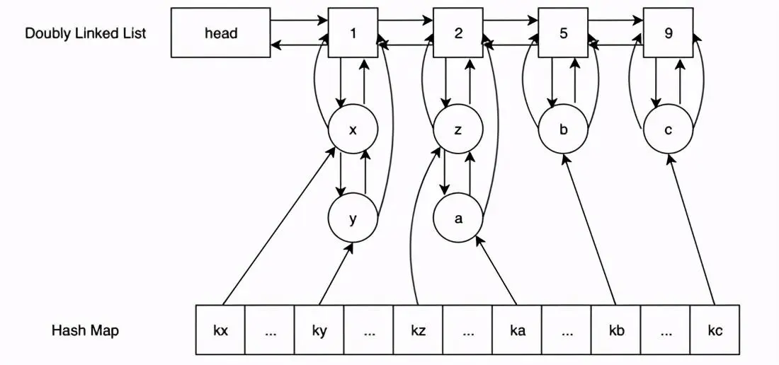 由两个双向链表+哈希表组成,上方的双向链表用来计数,下方的双向链表用来记录存储的数据,该链表的头节点存储了数字,哈希表的value对象记录下方双向链表的数据 我们这里按照插入的流程走一遍: