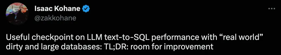 在学术界,过去的 text-to-SQL 基准仅关注小规模数据库,最先进的 LLM 已经可以达到 85.3% 的执行准确率,但这是否意味着 LLM 已经可以作为数据库的自然语言接口?
