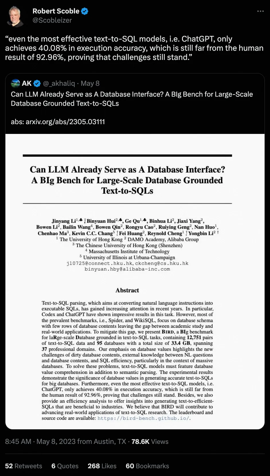 最近,阿里巴巴联合香港大学等机构推出了面向大规模真实数据库的全新基准 BIRD (Can LLM Already Serve as A Database Interface? A BIg Bench for Large-Scale Database Grounded Text-to-SQLs), 包含 95 个大规模数据库及高质量的 Text-SQL pair,数据存储量高达 33.4 GB。之前最优的模型在 BIRD 上评估仅达到 40.08%,与人类 92.96% 的结果还有很大差距,这证明挑战仍然存在。除了评估 SQL 正确性外,作者还增加了 SQL 执行效率的评估,期待模型不仅可以写正确的 SQL,还能够写出高效的 SQL。