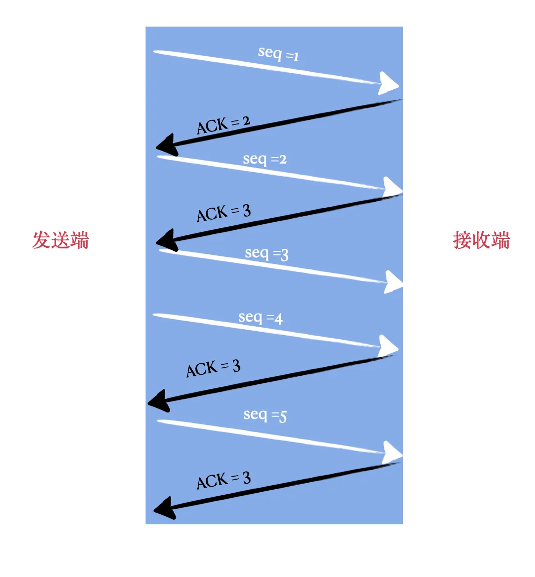 接收端回复的 ACK 会带着包的序号,当接收端重复三次收到同一个序号的ACK时,就要重传这个包;