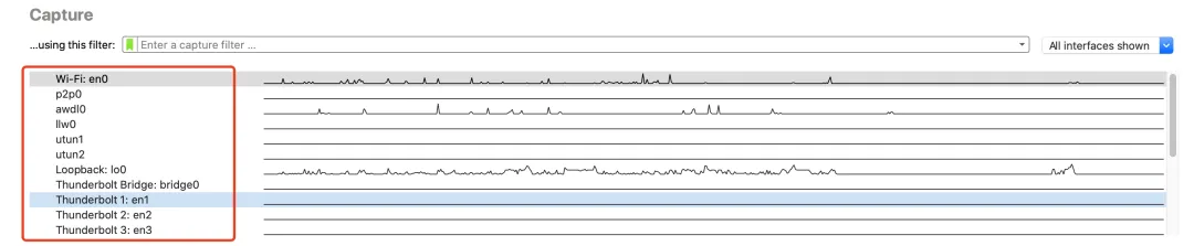 2、我接下来要用 Telnet 连接一个外网服务器,所以我选择第一个 WI-FI:en0,这样 Wireshark 就会捕获我连接的 wifi 上的网络传输。