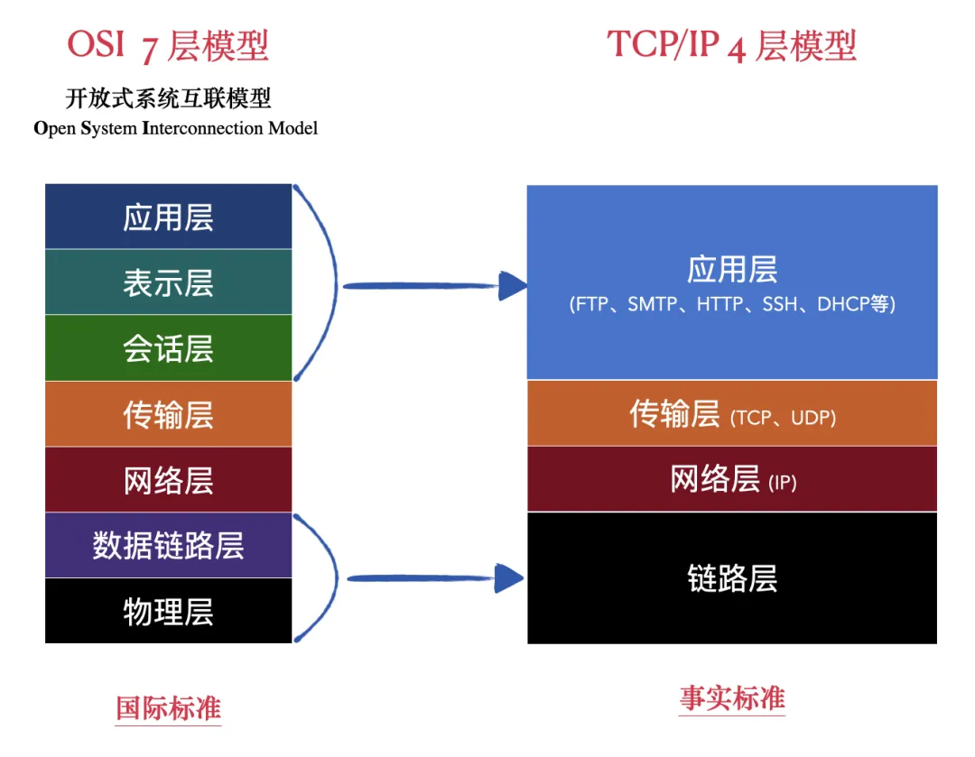 OSI 模型是国际标准模型,是指导互联网模型的概念标准。而在实际的设计实现过程中,最后形成了 TCP/IP 4层模型结构。