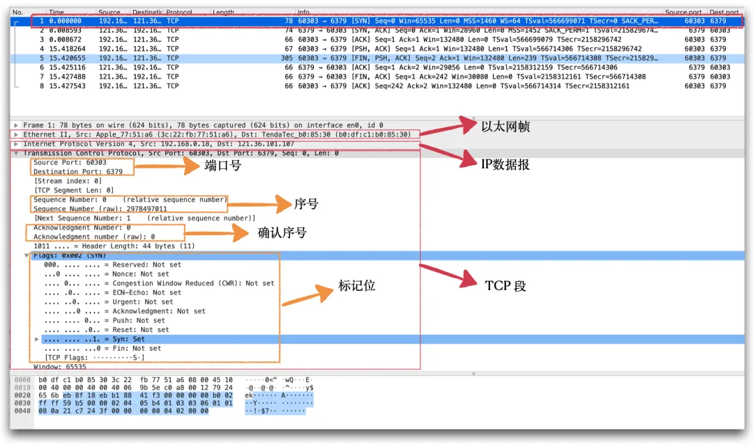 也就是图中最上面的红色框部分。这一次的连接建立和中断一共产生了来回 8 次的请求,每次请求会在列表上列出时间、源端IP、目的端IP、以太网帧长度以及概览信息,包括数据传输方向(源端口->目标端口)、标记情况、序号、确认序号、窗口大小等等。