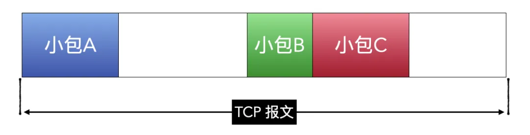 粘包就是将几个比较小的 TCP 包合并成一个包,这样就只发送一次就可以将多个小包发送出去。例如下面这样,一个TCP报文请求中,包含小包A、B、C,每一个小包原本都是一个TCP报文。