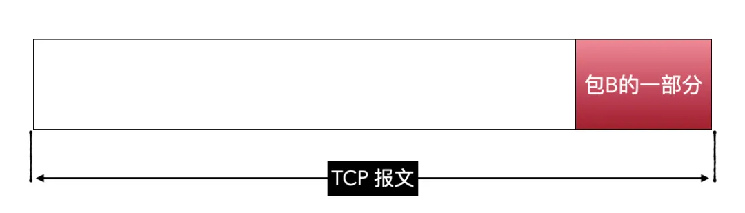 粘包是为了将多个小包变成一个大包,而半包是把超大包拆成小包。比如下图,假设包B是一个很大的包,已经超过了MSS 了,单单发送它自己都发不过去了,所以只能将它拆开,一部分一部分的发送。