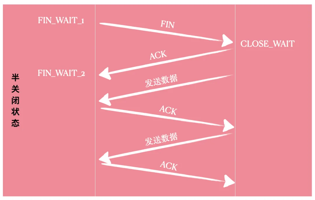 正常情况下需要四次挥手才能完成连接的完全断开。但是有一种情况是这样的,只主动关闭自己到对方的连接,但是对方还是可以给自己发送数据。