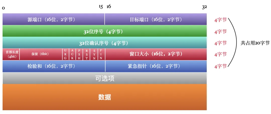下图是TCP协议的示意图,如果不算「可选项」部分的话,共占用 32bit x 5 = 160bit,也就是20个字节。