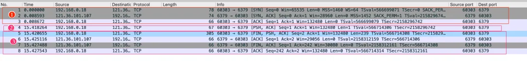 第一部分是连接建立的三次握手,第二部分是发了长度为 1个字节的数据,第三步是客户端主动发起的断开连接的四次挥手过程。