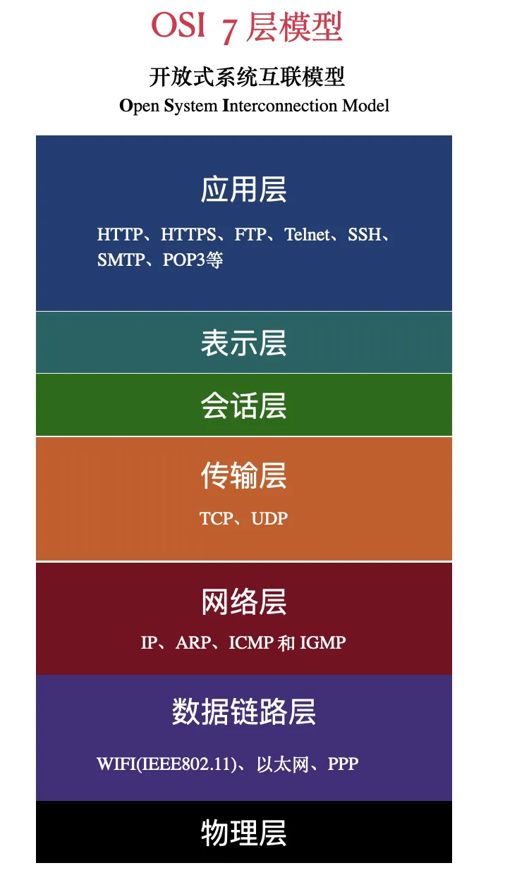 自上而下依次为应用层、表示层、会话层、传输层、网络层、数据链路层、物理层。