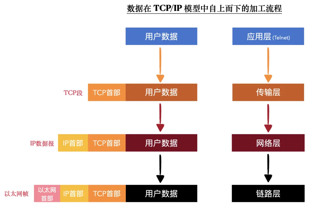 无论是 Telnet 还是 HTTP,都至少涉及到两台设备才能称之为网络互连,那发送方有一个数据自应用层向底层链路层的加工过程,对应的,在数据接收方,有一个数据从链路层向应用层解析的过程。这中间可能经历了漫长的传输介质,比如光纤,还可能有若干个中间设备,比如路由器、交换机等等。要保证数据在这么复杂的网络环境中可靠、准确的发送到目标机器,就是靠的 TCP、IP协议精巧的设计。