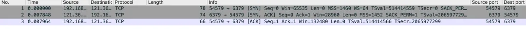 在控制台中连接到 6379 端口成功,然后在 Wireshark 上马上捕获到了。