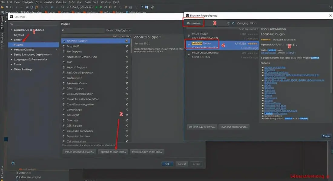 在输入框输入”lombok”,得到搜索结果,点击安装,然后安装提示重启 IDEA,安装成功;