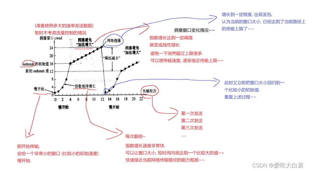 - 3.增长到网络拥塞,就循环进行上方的操作。