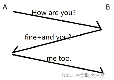 A对B说你好吗?这就相当于发送了同步报文段(SYN);很好,你呢?相当于发送了应答报文(ACK)+同步报文段(SYN);me too。相当于发送了应答报文(ACK)。