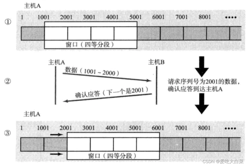 他是如何滑动的呢?收到第一个ACK后,滑动窗口向后移动,继续发送第五个段的数据;依次类推,这个形式运行起来就像一个窗口在滑动,因此才取名为滑动窗口。